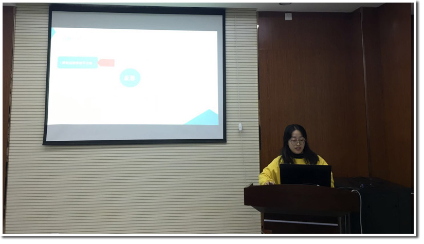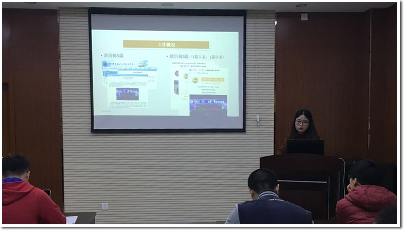 接着,宣传组组长汪璐对宣传组的工作进行了总结,展示了宣传组在一个月中做出的微信稿、新闻稿及海报等成果。她感谢各位成员的辛苦付出,与此同时也提出在今后的宣传工作中各成员都要学习并掌握一些基础的宣传技能、增加组内会议的次数以及多开展宣传技能培训等一系列建议。
