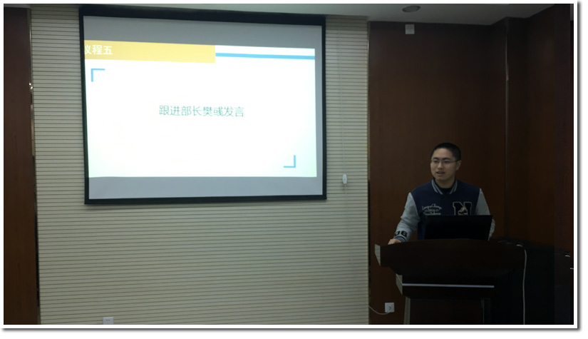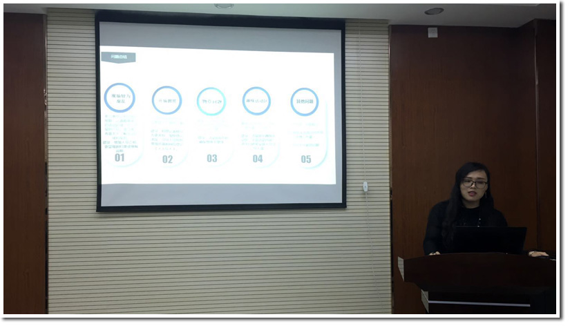 紧接着,外联组组长苗蕊从拉赞助、申请场地等日常工作中回顾了外联组的工作,并从人员分工、信息整理及衔接工作等问题给出了改进意见。她讲到,外联工作很多时候需要应急,这就要求组长在前期统计好组员的空余时间,保证有突发情况出现时能够及时地安排好人手。