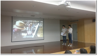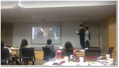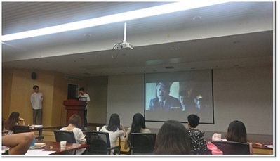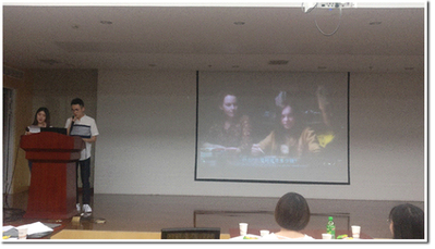 接下来进入电影讲解片段播放的阶段。第一部电影是《怦然心动》。这部电影从少男少女的青春心思着手,以精妙的构思和新颖的叙事方法给大家展现了从男生女生两个视角的截然不同的生活,从众多同题材电影中脱颖而出。在紧接着的配音环节中,现场两位同学用标准流利的英语完成了一段有关“整体大于全部”的电影片段配音表演。