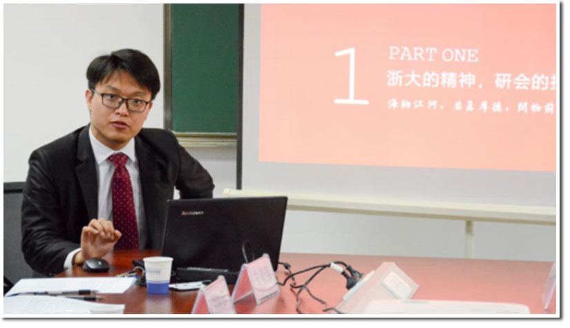 接着由浙江大学博士生会主席李得第发言,他重点介绍了博士生会的基本情况、工作重心、品牌活动等。并结合浙大博士生学术需求庞大、博士生占比高的特点,详细地介绍了博士生会在开展校园学术工作、博士生团实践方面的经验与心得。