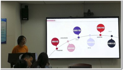 接着,17:20,宣传组组长吕丽对宣传组工作进行了总结,展示了宣传组在一个月中做出的微信稿,新闻稿及海报成果。她对各位成员的辛苦付出表示了真诚的感谢,但她也提到了组内ps等关键技术人员的缺乏,以及后期对现场物料的制作不够精细这两方面的问题。