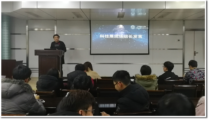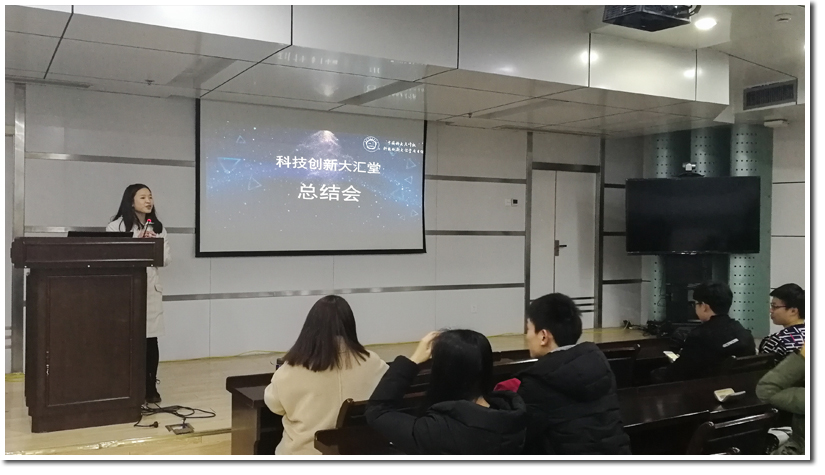 首先,负责人朱瑞琳对科技创新大汇堂从前期筹备到后期实施进行回顾。本次科技创新大汇堂是继2014年后再次启动,前期筹备遇到很多困难和问题,比如项目较大,周期较长,项目组人员较少,科技展活动当天很冷,活动时间涉及工作日,但是在项目组成员和全体志愿者努力下,科技成果展现场当天和决赛答辩都很顺利的完成。