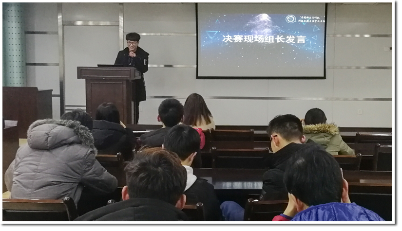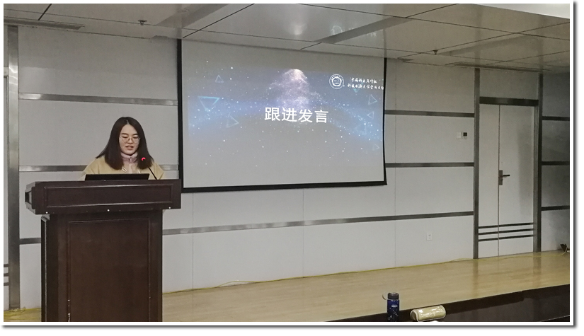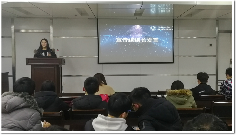 宣传组组长宋相杰说明此次赛事宣传组主要完成的工作,例如微信稿、新闻稿、海报、视频等等,并在贴吧、BBS等平台上进行广泛宣传,取得了很好的宣传效果。她说项目组每位小伙伴与志愿者都很努力、很优秀,整个项目的成功举办离不开他们的辛勤付出。