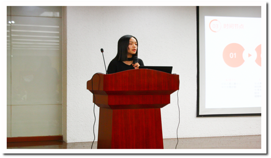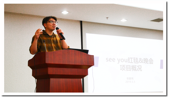 会议伊始,项目负责人卢滢欢迎大家的到来,并介绍到场的嘉宾及会议流程。之后进行会议第一项内容,负责人张家玮对项目概况展开介绍。宣布两位负责人的分工后,他强调今年的活动与去年相比在诸多方面会发生变化。在主题上,今年恰逢五四运动一百周年和建国七十周年,活动首先要突出时代精神,当代青年当以青春之我创造青春之中国,中国科大的毕业生更要传承五四精神,谱写新时代青春华章,这也是晚会要表达的主旨;相比去年,红毯走秀以及“See You”晚会在举办地点和两者间关系等方面也有所变动。由此张家玮对活动主题的确定及节目形式的质量和创新性提出了更高的要求。结合时间节点介绍项目工作流程后,张家玮在发言的结尾部分表示,希望大家牢记正规、协作、创新、温情的研会价值观,在实践中做到仔细、认真、踏实、高效,彼此间做好联动,让整个项目组凝聚成一个团结有力量的整体。