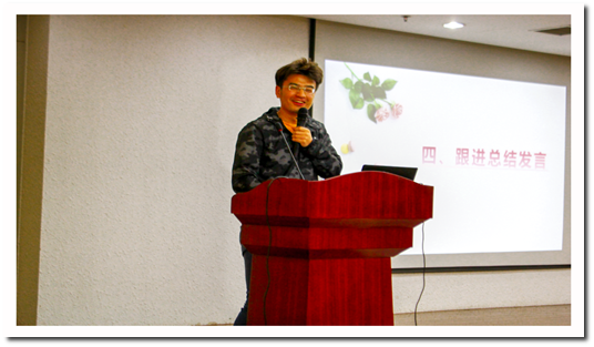 其后是会议第四项内容,项目跟进常委钟尚上总结发言。他强调红毯暨晚会活动在规模上居于研会本学期之最,期待大家能努力用心做到最好。之后他结合去年负责校庆晚会的亲身经历,帮助项目组成员建立信心,指出研会之前积淀的丰富经验都会是大家做好项目的保障和助力。最后,他希望大家不忘初心,保持热情,把时间和精力放在项目里,办好此次活动的同时,都能收获一段宝贵的体验。