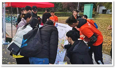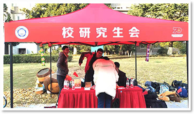 校研究生会负责的同学在本次活动中热情服务,为参加长跑的同学们提供充分的后勤保障工作。上午9点半,研会供给点物资全部搬运到场,宣传点也开始进行布置。宣传点设有补给帐篷、领奖区和宣传展板,并用研会往期活动的精彩照片作为宣传装饰,富有研会特色。除了为长跑同学们准备了热水、奶茶、小零食和应急药品以外,他们还向同学们发放国旗贴纸与纪念品,激发大家的爱国热情与活动积极性。