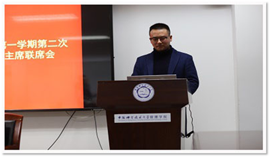 12月15日下午14:30,2019-2020学年第一学期中国科学技术大学研究生会第二次院系主席联席会在管理科研楼912会议室顺利召开。出席会议的有校团委赵林老师、校研究生会主席赵乐陶、校研究生会委员、各院(系、直属单位)研究生会主席,校研究生会各职能部门部长列席会议。会议由管理学院研究生会主席程鑫主持。