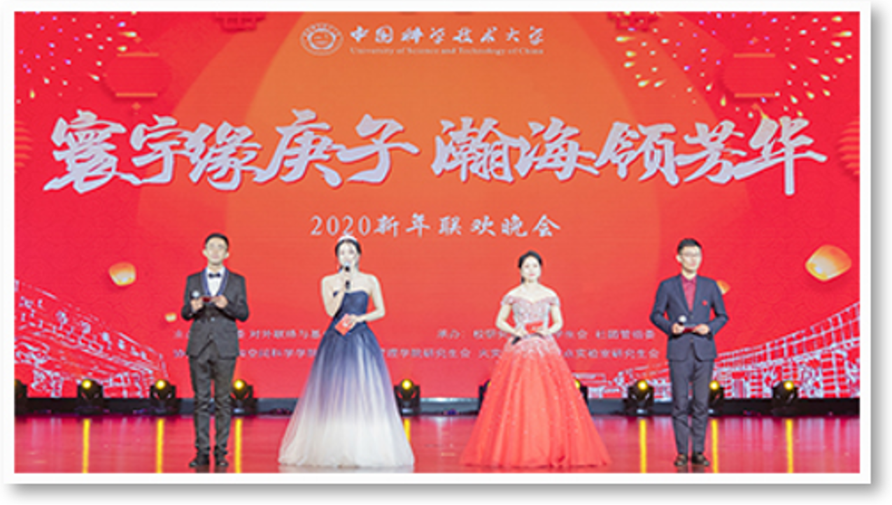 2019年12月28日晚, 中国科学技术大学2020新年联欢晚会在东区礼堂圆满落幕。校党委副书记蒋一、新尚集团产业发展部总经理刘承红、讯飞产业投资有限责任公司董事长徐景明、对外联络与基金事务处常务副处长周宇、校团委书记杨晓果、少年班学院党总支副书记兰荣、数学学院党委书记黄文、物理学院党委副书记凌锋、化学与材料科学学院党委副书记周小东、信息科学技术学院党委副书记王童、生命科学学院教授、校团委兼职副书记朱书、人文与社会科学学院党委书记褚建勋以及各机关部处老师莅临现场,与近2000名师生共同观看了本场演出。