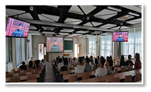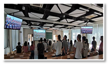 大会开始时,全体师生起立跟随大会直播一起唱国歌,庄严而又神圣的气氛感染了在座的每一位师生。