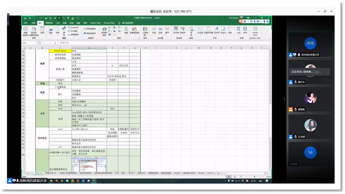 5月30日上午九点,中国科学技术大学研究生会人力资源部2019-2020学年第三学期第三次干部培训在腾讯会议举行。参加本次培训的有人力资源部部长孔冰娴,副部长蔡叶申、阳港及校研会和各院系研会六十余名干部。本次培训会由人力资源部黄聪聪主持,主讲人为胡坤禹。而今天主要讲解的内容就是EXCEL的进阶操作。
