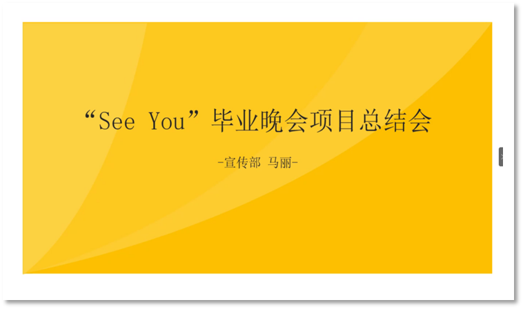 会议第一项,由负责人陈舫向大家介绍本年度“See You”毕业纪念晚会项目的整体概况。首先她介绍了线上晚会的数据,可以看出,此次See You晚会直播时长4.3小时,最高人气值达5.3万,弹幕数1.5万,为宣传平台带来1221的新增关注数,整体来说,起到到了很好的宣传效果;接下来由前期准备、彩排和现场、收尾工作总结了项目的不足之处以及对未来的展望;最后陈舫对大家长期以来的付出表示肯定与感谢,并期待开学可以与大家进行线下见面。