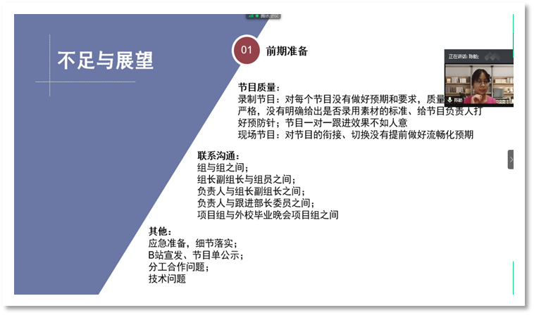 会议第一项,由负责人陈舫向大家介绍本年度“See You”毕业纪念晚会项目的整体概况。首先她介绍了线上晚会的数据,可以看出,此次See You晚会直播时长4.3小时,最高人气值达5.3万,弹幕数1.5万,为宣传平台带来1221的新增关注数,整体来说,起到到了很好的宣传效果;接下来由前期准备、彩排和现场、收尾工作总结了项目的不足之处以及对未来的展望;最后陈舫对大家长期以来的付出表示肯定与感谢,并期待开学可以与大家进行线下见面。