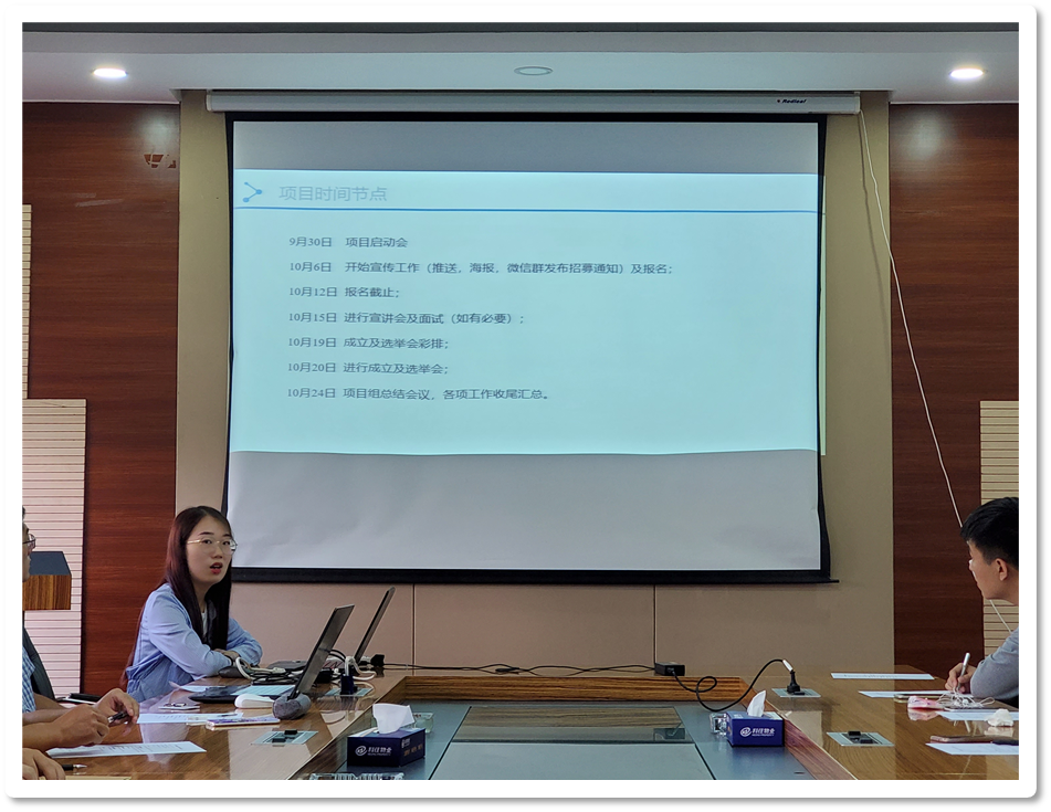 2020年9月30日12点30分,2020-2021学年筹建所系学生工作中心项目启动会于西区电二楼信息科学技术学院102会议室正式召开。出席本次启动会的有项目跟进委员李永哲、工作委员王谢燕、办公室主任陈舫、人力资源部部长刘明珠以及项目组全体成员,会议由项目组赵浩东主持。