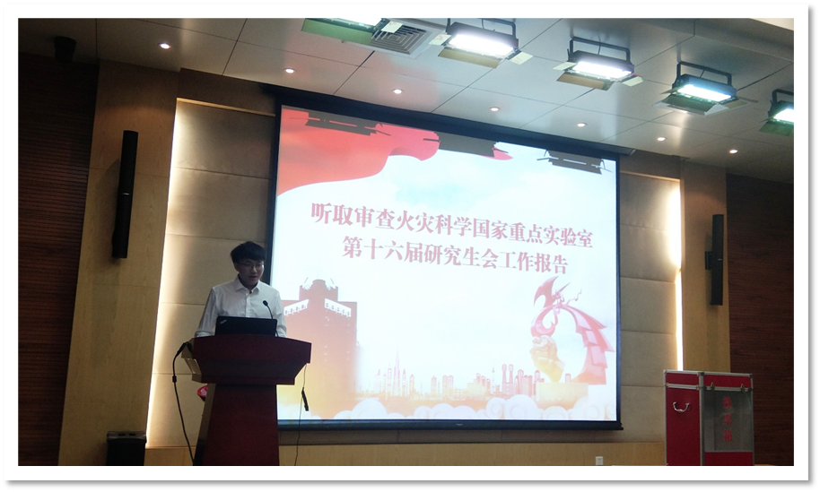 大会进行第二项,听取火灾科学国家重点实验室研究生会主席潘传鱼代表第十六届火灾实验室研究生会所作的题为《坚守服务“六有”大学生培养初心,加快构建研究生会新发展》的工作报告。在工作报告中,潘传鱼对本届研究生会工作做了回顾,同时指出了研究生会未来的发展目标与主要任务。最后,他号召实验室全体研究生勇担时代使命,贡献青春力量,紧密团结在以习近平同志为核心的党中央周围,学习贯彻党中央、团中央的重要思想和会议精神,在决胜全面建成小康社会,夺取新时代中国特色社会主义伟大胜利,实现中华民族伟大复兴的道路上,同人民一起奋斗,同人民一起前进,同人民一起梦想,用一生来践行跟党走的理想追求。
