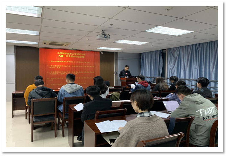 10月24日下午18:30,中国科学技术大学第九届研究生会委员会第一次全体会议在地空楼702A706会议室召开,校研究生会第九届委员会委员参加了此次会议,本次会议由张鸣帅主持。本次会议主要议程是通过中国科学技术大学第九届研究生会主席团执行主席人选和选举产生校研究生会第九届专项工作委员会委员。