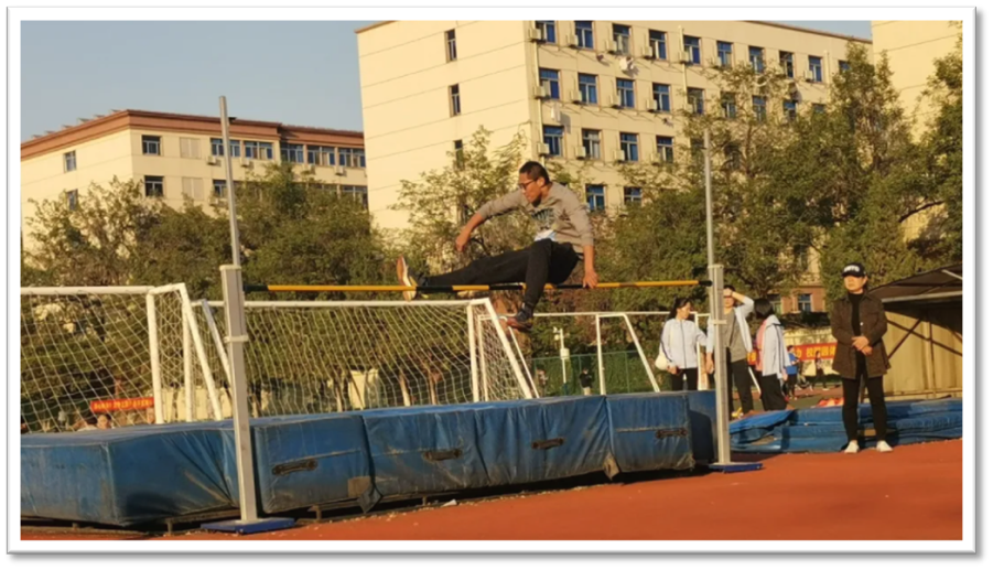 朱小龙老师姿势标准,优雅越过跳高杆,取得男子教工跳高第六名的好成绩。