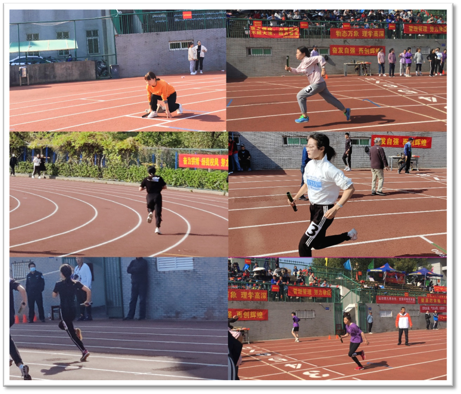 女子竞赛和田赛中,选手们同样是驰骋赛场。唐琪和艾雨星同学分别以16.13s和16.35s,斩获女子100米第三和第五。赵江月同学3’07”48,获得女子800米第六名。宋雪华同学38.80s,获得女子200米第八名。唐琪同学在女子跳远组以3.82米的成绩拿下第一名。陈缪同学获女子跳高第二名、女子铅球第四名的双料奖项。