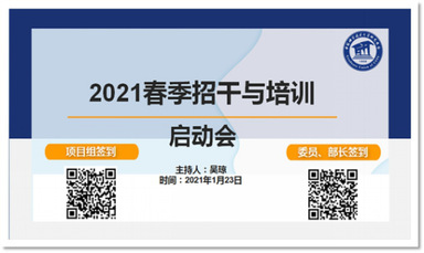 1月23日晚7:00,2021年校研究生会春季招干与培训项目启动会以线上会议的形式召开。校研究生会主席团成员郑倩、委员王谢燕、项目跟进委员翟宏举、办公室主任陈舫、人力资源部部长刘明珠、宣传部部长李昀松、学术科技部部长计欣晔、权益服务部部长谭淳天、实践交流部部长邱威、负责人吴琼以及项目组各成员参加了本次启动会,会议由负责人吴琼主持。