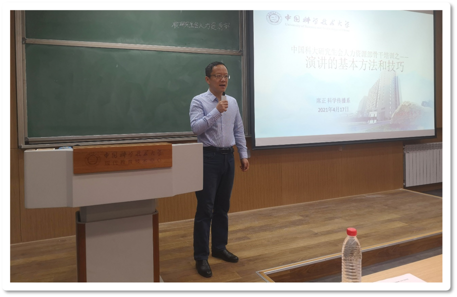 2021年4月18日晚,中国科学技术大学研究生会2020-2021学年第二学期第二期骨干培训会在东区第五教学楼5107顺利举办。本期骨干培训主题为《演讲的基本方法和技巧》,中国科学技术大学人文社会与科学学院科技传播系席正老师受邀担任主讲嘉宾,来自校研究生会、院系(直属)研究生会等学生组织的四十余名学生骨干参与了本期培训。