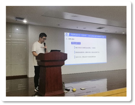 而后,负责人贺鹏介绍了本次优秀院系评比项目的整体情况,从项目概况、关键时间节点、注意事项三个部分展开叙述;同时,他也希望大家在参与项目工作时能够全身心投入,能在此次项目中得到锻炼,有所收获。