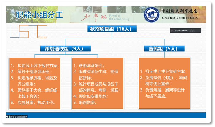 随后,各个职能小组组长针对各自小组的具体情况,就本组工作进行了介绍与安排。策划通联组组长潘昱宸介绍了本组成员,并分别就策划和通联两个部分的工作做了简要的介绍,对工作内容和工作要点提出了注意事项。
