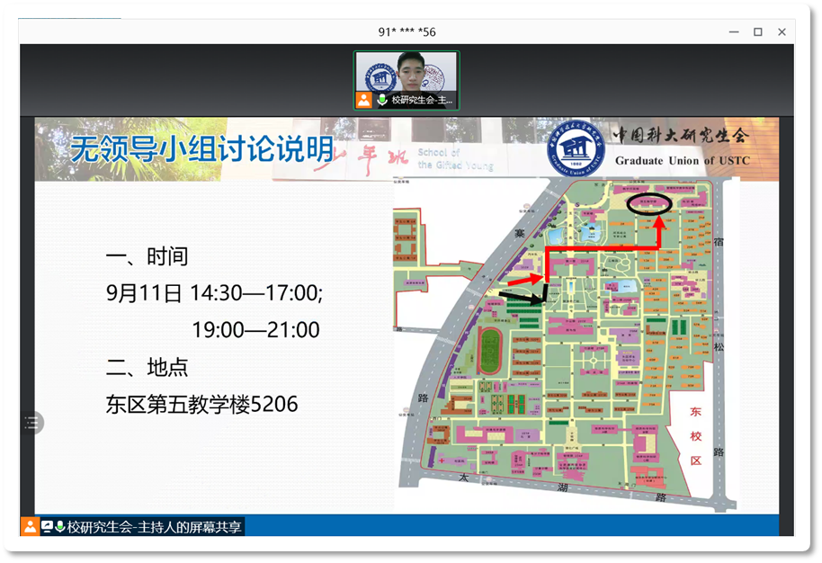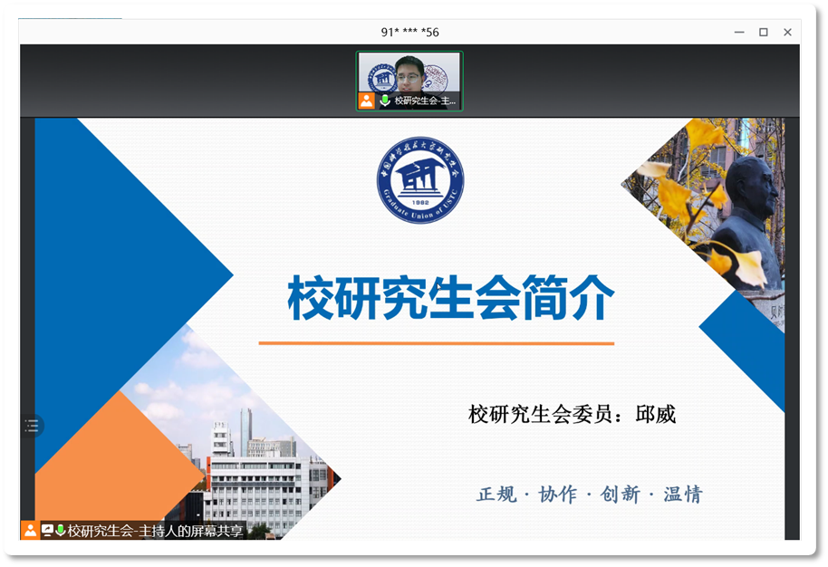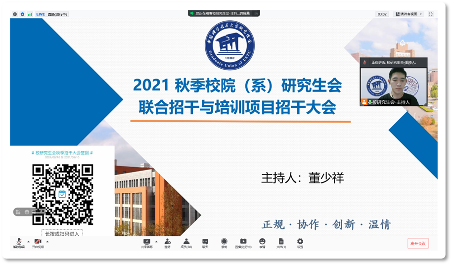 经过短暂的休息后,招干大会进入了今天的最后一个环节,其他院系研究生会开展线上招新介绍。数学科学学院研究生会主席团成员张鸣轩、地球和空间科学学院研究生会执行主席张杨睿、管理学院研究生会主席团成员朱耀宗、国家同步辐射实验室及核科学技术学院本科生任麒睿(代讲)、合肥微尺度物质科学国家研究中心研究生会主席团成员朱少通,分别从校研究生会构架、部门职能、校研究生会活动方面生动形象地展现了各自学院的特色和风采,并欢迎各位同学的到来和参与。自此,本次2021校院(系)研究生会秋季联合招干与培训项目招干大会圆满落下帷幕。