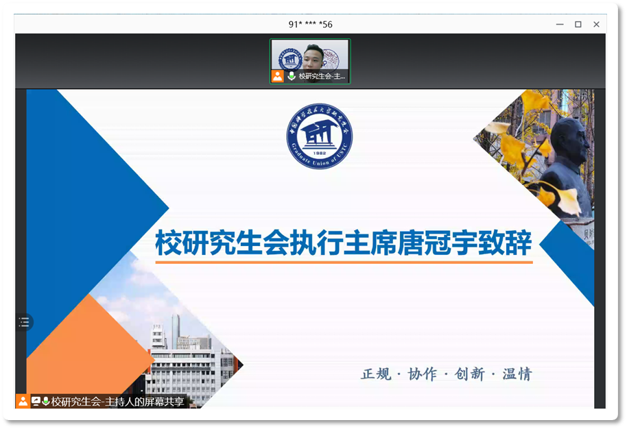 会议首先由校研究生会主席唐冠宇为全体参会人员致辞。唐冠宇主席首先代表校研究生会欢迎各位同学来到科大。接着,他向大家深刻阐述了加入校研究生会对自己能力提升的作用,希望大家能在校研究生会中实现自我建设和自我成就。最后,他向全体参会同学的参与和对校研究生会的信任表示感谢,祝愿校研究生会能为全体同学的学习生活带来帮助,给校园生活增添一抹色彩。