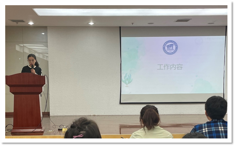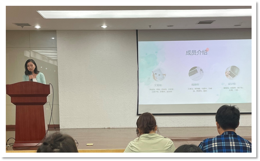 宣传组组长张颖对视频组、设计组与文案组三个部分的宣传工作进行了介绍,并且对各个宣传的时间节点做了概述,最后提出了本次宣传组的工作宗旨——“快乐,用心,创意”。