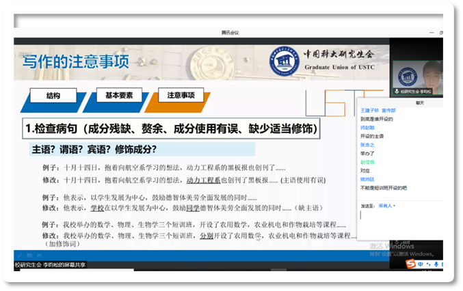 最后,李昀松同学以“如何写好一篇新闻稿”为题,从新闻的认识、新闻稿的写作以及新闻的摄影这三个方面,深入浅出地展开了精彩的培训。他首先以新闻的定义、特性以及构成来浅谈新闻;其次,以新闻稿的构成来详细讲述新闻稿写作的相关技巧和注意事项,结合自己多年的写作经验,提出了新闻稿写作的“5W1H”模型,值得一提的是,在注意事项环节,他通过检查病句的方式与大家进行了线上互动,在互动环节,同学们将现场所学运用于实际,本场培训的氛围也因互动变得更加丰富生动。