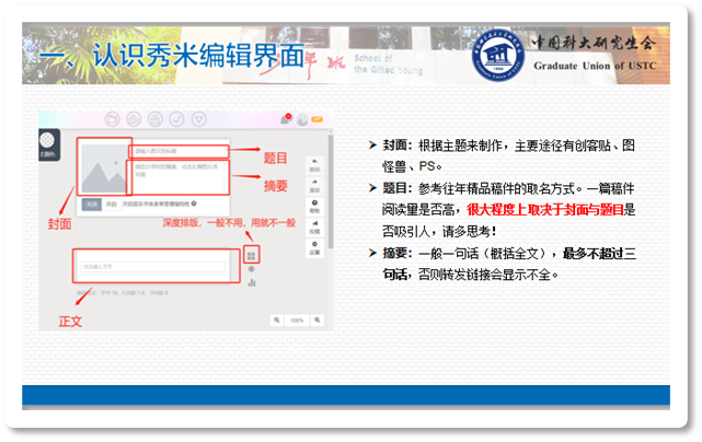 首先,王紫玉同学从基本操作、使用技巧和上手实战三个角度展开秀米编辑培训。她详细介绍了秀米图文的编辑方法,通过秀米平台的实战操作为大家演示了一篇完整的推文是如何形成的,并在培训结尾,为大家集中进行秀米编辑的线上答疑。