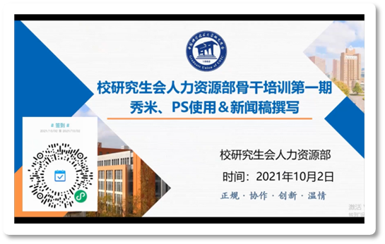 10月2日下午14:00,2021-2022学年第一学期校研究生会第一期骨干培训在腾讯会议举办。培训内容包括秀米编辑、PS使用和新闻稿撰写,本次培训邀请了校研究生会主席团成员李昀松、宣传部副部长陈怡和学术科技部副部长王紫玉担任主讲嘉宾。来自校研究生会、校学生会、社团管指委、院(系)直属研究生会等学生组织的166名学生骨干参加了本次培训。本次培训由校研究生会人力资源部骨干王宁薇主持。