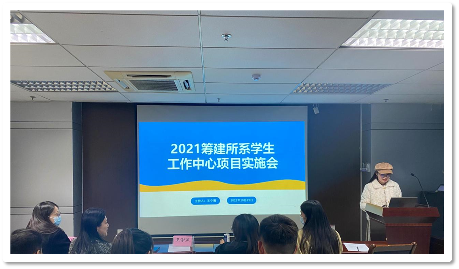 2021年10月22日19点,2021-2022学年筹建所系学生工作中心项目实施会于东区地空楼702A706会议室正式召开。出席本次实施会的有项目跟进王谢燕、办公室主任董少祥、人力资源部部长李桦楠、宣传部部长陆荷萍、权益服务部部长程淑媛、实践交流部部长南亦宁以及部分项目组成员。本次会议由项目负责人王宁薇主持。