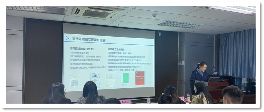 会议第二项,由宣传外联组组长毕竹韵和策划会务组组长韩宜池从招新面试阶段以及选举成立会准备阶段两个方面汇报了策划会务组的工作并对下一阶段工作进行了规划。