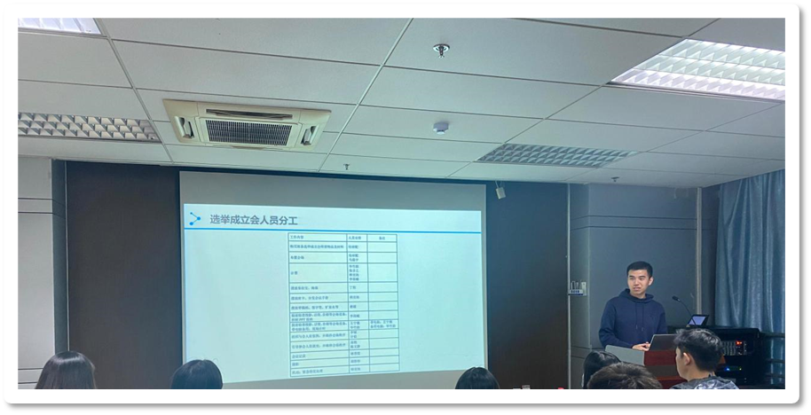 会议第三项,由策划会务组组长韩宜池介绍了各位组员在选举成立会阶段的分工以及选举成立会的具体流程细节。