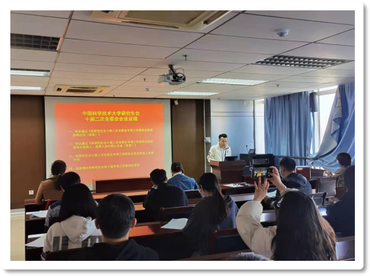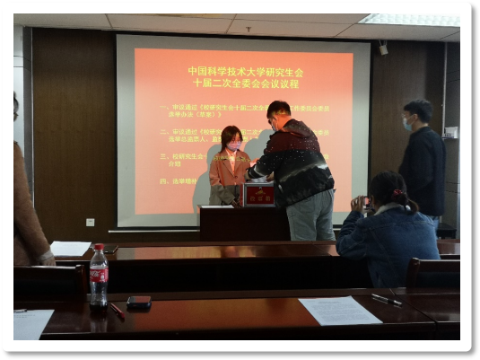 11月19日中午12:00,中国科学技术大学第十届研究生会委员会第二次全体会议在地空楼702A706会议室召开,校研究生会第十届委员会委员参加了此次会议,会议由校研究生会执行主席唐冠宇主持。本次会议主要议程是选举增补校研究生会第十届专项工作委员会委员。