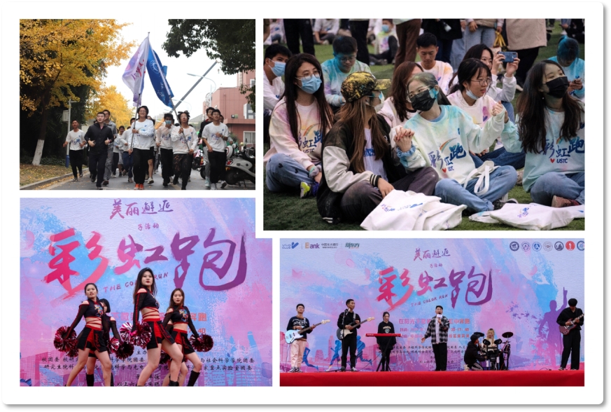 伴随着激昂的乐曲、热情的舞蹈,本次活动正式拉开帷幕。在工作人员的引导下,参赛同学有序到彩虹跑起跑线附近集合。伴随着起跑口令,领跑者带领参跑者沿计划路线奔跑。这里没有竞技赛的紧迫,只有五彩粉末洒向空中的祝福,只有纵情奔跑带来的享受与舒畅。