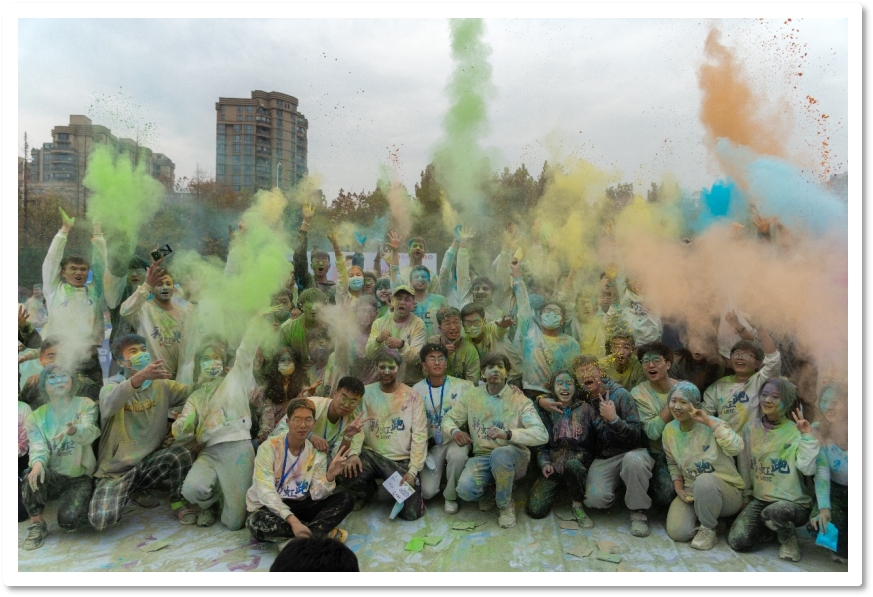 张扬的青春里,总要有一次纵情地狂欢。彩虹狂欢区是本次活动最具特色的部分,同学们在这里尽情地抛撒彩粉,留下自己的色彩,释放自己的热情。
