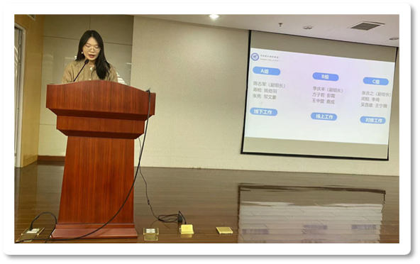 外联组组长陈至伟对外联组做了工作介绍,她从人员介绍、工作内容、时间安排与注意事项四个方面做出了阐述。由于外联工作机动性强,主要包括联络工作和物资管理工作,因此将人员分为线下工作、线上工作和对接工作三组,并详细说明了每组需要完成的事项以及对应的时间节点。最后对从个人、做事和交流三方面对组内成员提出期许,力求打造团结高效,积极温馨的外联团队。