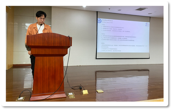 外联组组长陈至伟对外联组做了工作介绍,她从人员介绍、工作内容、时间安排与注意事项四个方面做出了阐述。由于外联工作机动性强,主要包括联络工作和物资管理工作,因此将人员分为线下工作、线上工作和对接工作三组,并详细说明了每组需要完成的事项以及对应的时间节点。最后对从个人、做事和交流三方面对组内成员提出期许,力求打造团结高效,积极温馨的外联团队。