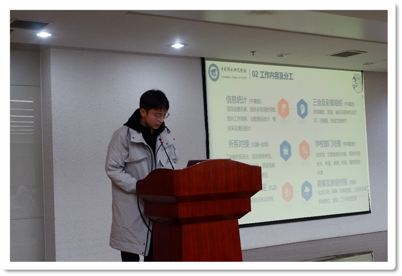 会议伊始,项目负责人赵佳恒对到场嘉宾致谢,并向到场人员介绍项目概况。赵佳恒指出,“科大·温馨家园”是在我校“全院办校·所系结合”的办学方针指导下,面向科教融合学院与代培生群体的科大品牌活动,旨在加强所系同学对科大的归属感与认同感。接着赵佳恒展示了活动的几大重要组成部分,并简要罗列了三个职能小组的分工板块,梳理了项目进程的时间线。最后他鼓励项目组全体成员共同努力,团结协作,在继承往期宝贵经验的基础上有所创新,为本次活动增光添彩。