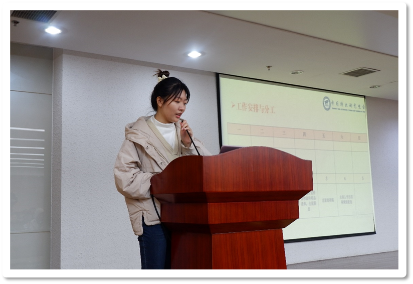 策划现场组组长蔡媛从项目的工作安排、时间节点、工作要求三方面出发,对项目进行了详细介绍,她希望同学们能够在活动的整体流程中与组长保持沟通,有任何问题及时反馈,并建议同学们及时更新已完成的任务表格。
