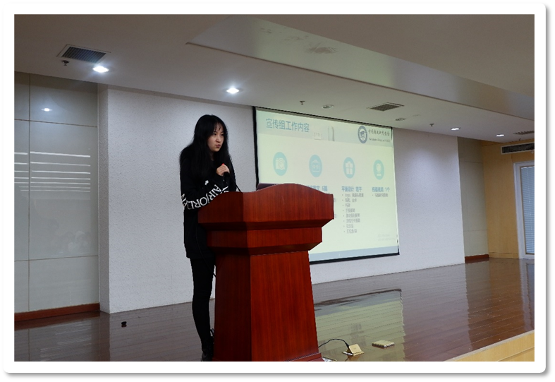 外联组组长闵锐就工作内容及分工、进度规划、注意事项等内容向项目组成员进行了详细地说明,并将外联组的各项文档资料进行了展示。最后,她对小组成员提出了“在项目中学习、沟通、积累经验”的要求,并鼓励外联组同其他小组团结合作,共同办好本次活动。