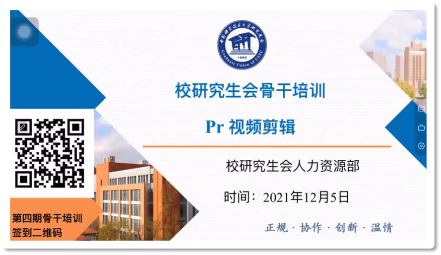 经过一个小时的线上讲解,本学期校研究生会第四期骨干培训圆满结束,相信通过本次理论与实践相结合的方式,同学们对于怎样剪辑视频有了更好的认识和更深层次的技能储备。