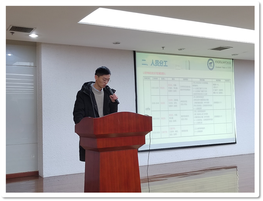 首先,项目负责人赵佳恒就2021“科大·温馨家园”所系结合联谊活动项目的整体工作进度进行简要汇报,总结了筹备期间策划、宣传和外联组的工作成果,并安排了活动当天各区域的活动流程。