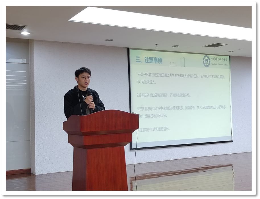 校史馆负责人吕成亮以时间顺序介绍了活动的具体流程,从人员分工、活动内容及注意事项方面对活动进一步进行了介绍,并展示了具体的路线示意图,提醒大家注意时刻维护秩序及防疫事项。
