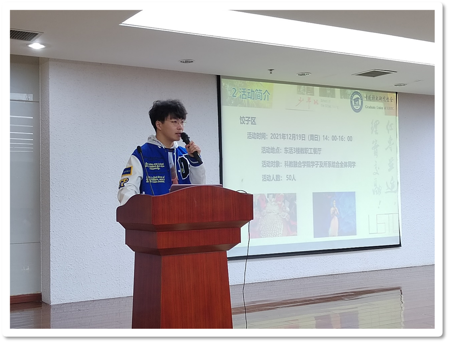 首先,项目负责人赵佳恒就2021“科大·温馨家园”所系结合联谊活动项目的整体工作进度进行简要汇报,总结了筹备期间策划、宣传和外联组的工作成果,并安排了活动当天各区域的活动流程。