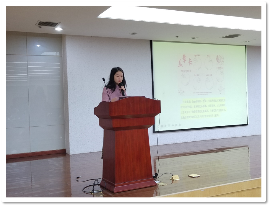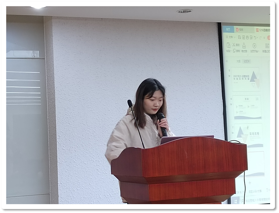随后,策划现场组组长蔡媛从现场流程、二次彩排、人员就位三个方面对活动进行了介绍,详细说明了游园会、饺子区、校史馆三块区域的工作侧重点和注意事项。