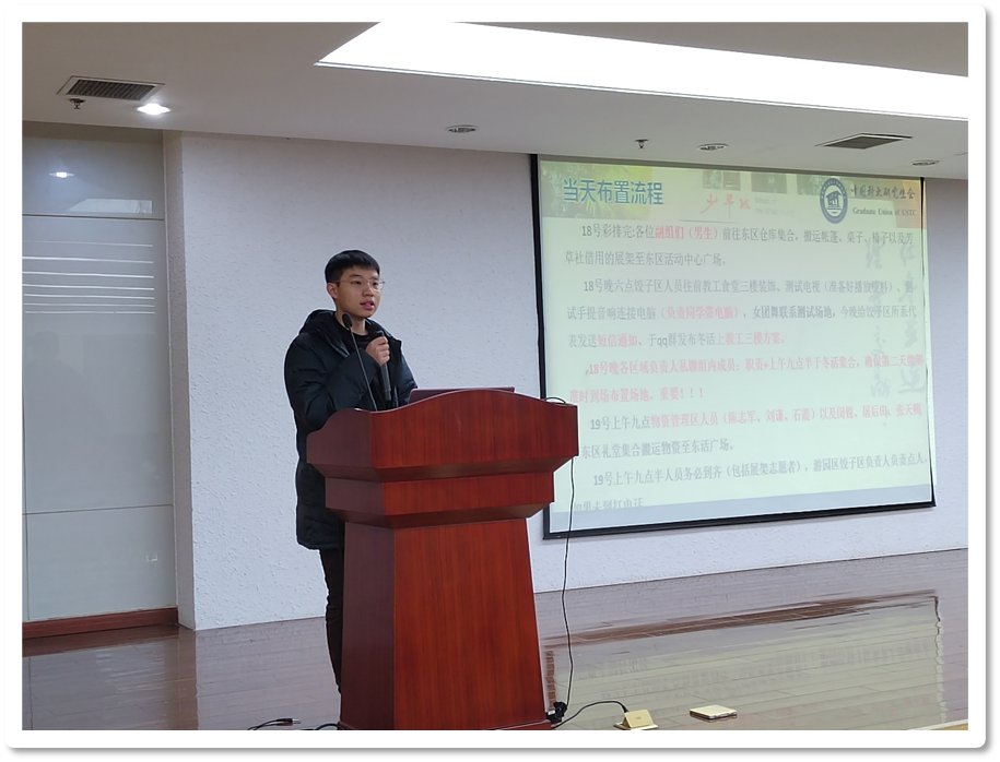 饺子区负责人朱雨恒首先对饺子区的工作进行了概述,并展示了饺子区的内部分布。他详细介绍了包括舞台区、桌控、服务台等饺子区内的人员分工安排,仔细梳理了活动流程,强调全体人员注意各时间点的任务,并相信在全体成员的齐心协力下活动一定会圆满完成。