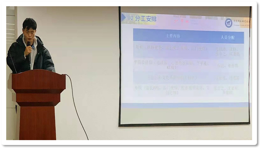 随后,各职能小组组长先后对小组工作规划进行了介绍。首先,策划会务组负责人牛昊进行工作计划介绍,他从成员介绍、工作内容及分工和工作进度规划三方面进行介绍。他指出小组中将分为舞台组和场地组,希望小组成员在游戏设置及布置要考虑实际场地限制。