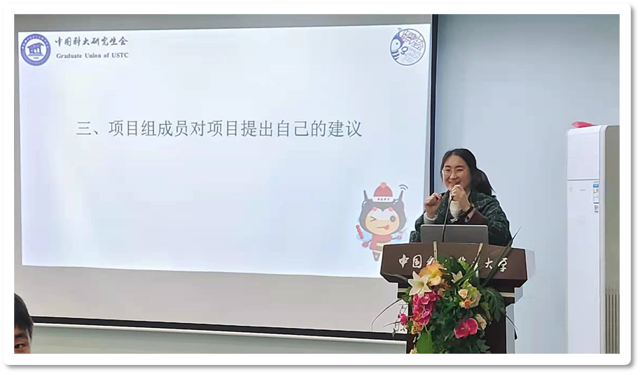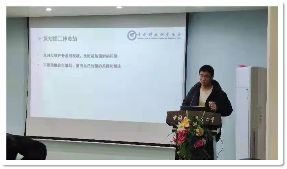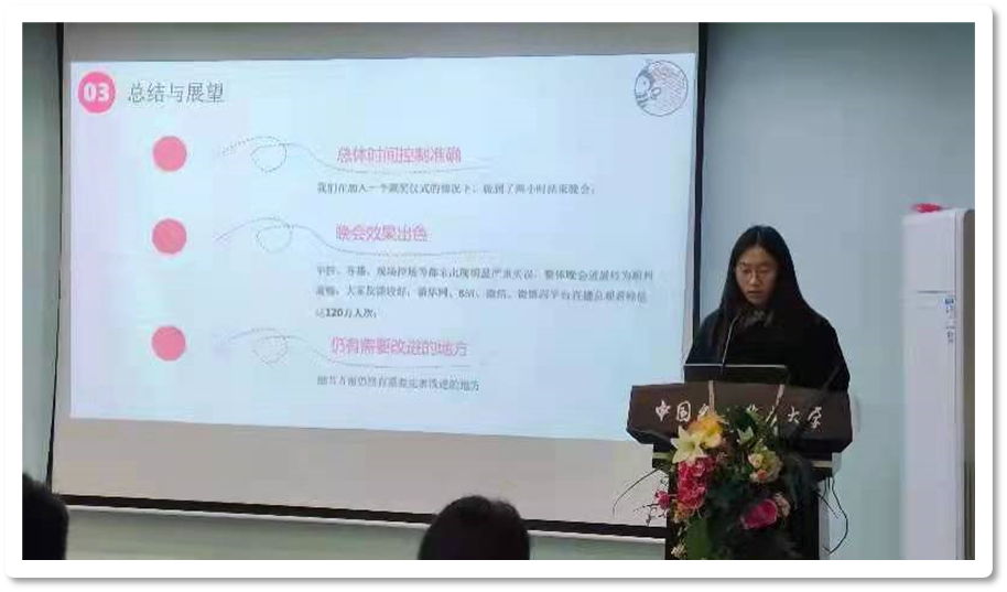 项目负责人胡玮怡总结了策划组、宣传组、外联组的各项工作,肯定了三个组的工作,并指出了一些不足之处,并提出了一些可行的建议。